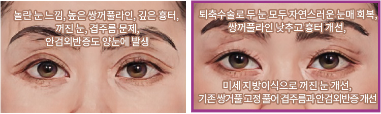 눈매교정술 후 놀란 눈처럼 커진 경우 외모 문제뿐 아니라 심한 안구건조증 같은 눈 건강 문제도 유발됩니다.